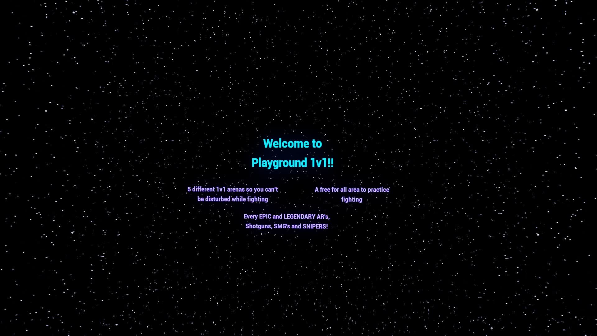 One of the best free-for-all/1v1/practice maps. This map has 5 different 1v1 arenas to practice against random players or your friends without the hassle of others breaking builds, etc. This map also has a free-for-all massive area where you can practice fighting against other people.