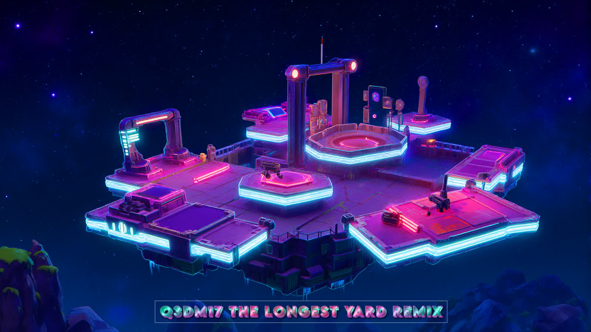 Q3DM17 Remix — 8-player FFA. Fast, skill-based arena with Double Damage spawns, HP and armor increased to 200, plus small and large shield banks. First to 100 points wins.