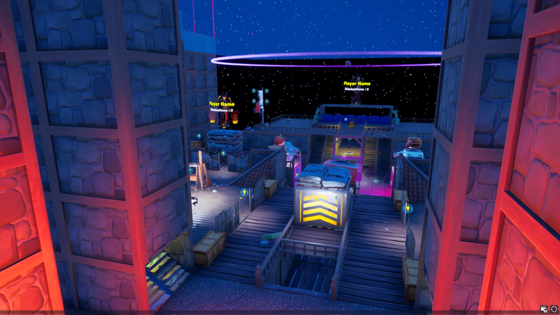On an abandoned space junkyard, up to 16 people fight it out using fast speed, low gravity, and Flintknock pistols. You can pick up Flintknock pistols from eliminated players, and use the gold you get to buy upgrades from the vending machines at the shop. First player to 50 eliminations or player with the most elims by the end wins!